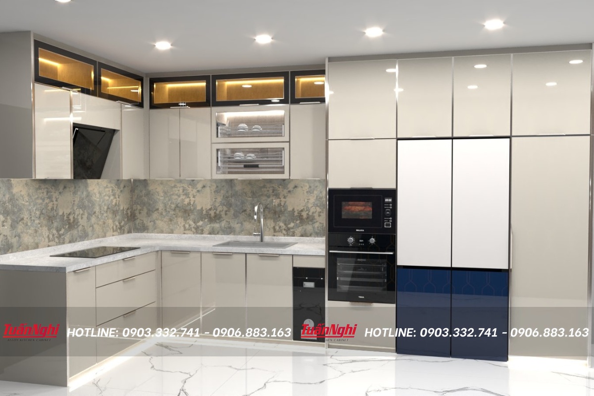 - Màu sắc của tủ bếp chữ L hợp kim nhôm TB33 được thiết kế tối giản giúp không gian bếp trở nên sang trọng, phù hợp với nhiều kiểu thiết kế nhà khác nhau
