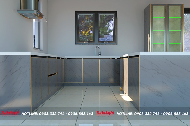 - Tủ bếp chữ U hợp kim nhôm TB71 có thiết kế sang trọng, tinh tế làm nổi bật không gian bếp của ngôi nhà.